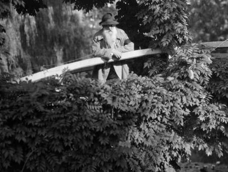 Painting: The Water Lily Pond, 1899 and a photo of Monet on the Water Lily Pond Japanese Bridge